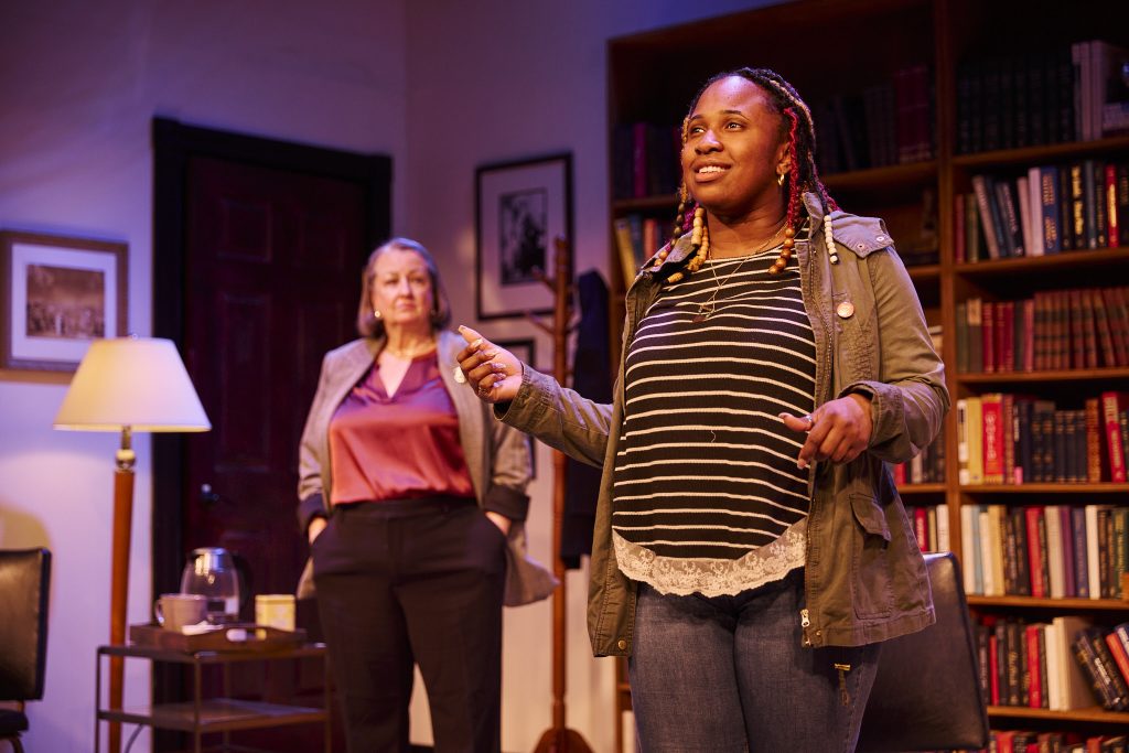 Zoe, played by Anika Pace (last seen as May in Junie B. in Jingle Bells Batman Smells at Buffalo’s Theatre of Youth), embodies the role of an activist and changemaker with fervor. Pace’s portrayal of Zoe’s passionate arguments about the systemic oppression and marginalization of African Americans during the founding of white supremacist culture in America is nothing short of mesmerizing. Her character consistently meets Janine’s rebuttals, forcing the professor to confront her unacknowledged advantages as a white woman in academia. The scene grows even more cynical as Mangus’ character tries to dominate Zoe, using her power over academic evaluations to intimidate her into abandoning her beliefs. Pace’s portrayal of Zoe’s righteous rage is exemplary, and she delivers her lines with remarkable composure, creating a tense and dramatic moment between the two actors.