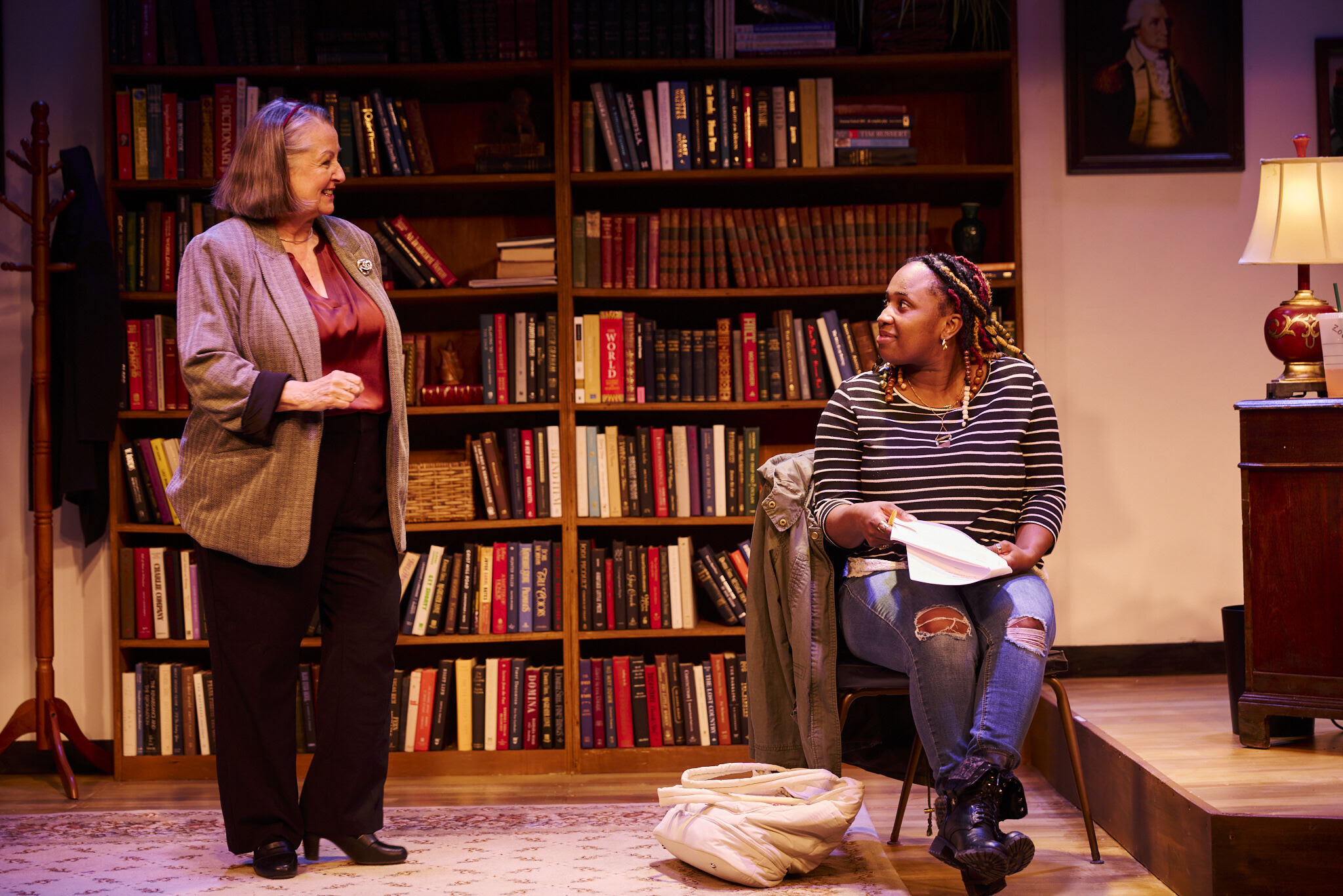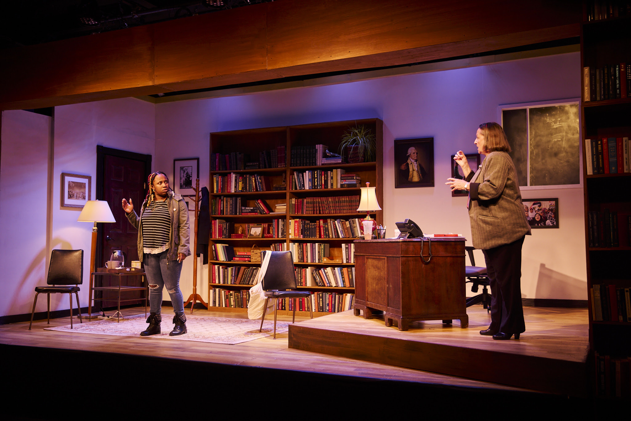 The meticulously crafted props and books invite us into Dr. Janine Bosko’s office hours. This is hands-down one of the best scenic designs I have seen on this stage.